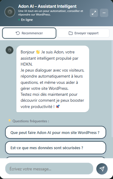 Adon AI n’est pas un simple chatbot : c’est un assistant conversationnel complet, capable de s’adapter à votre activité, à vos clients et à votre ton de marque. Il s’intègre facilement sur votre site web et devient un outil stratégique pour votre expérience client et votre performance commerciale.
